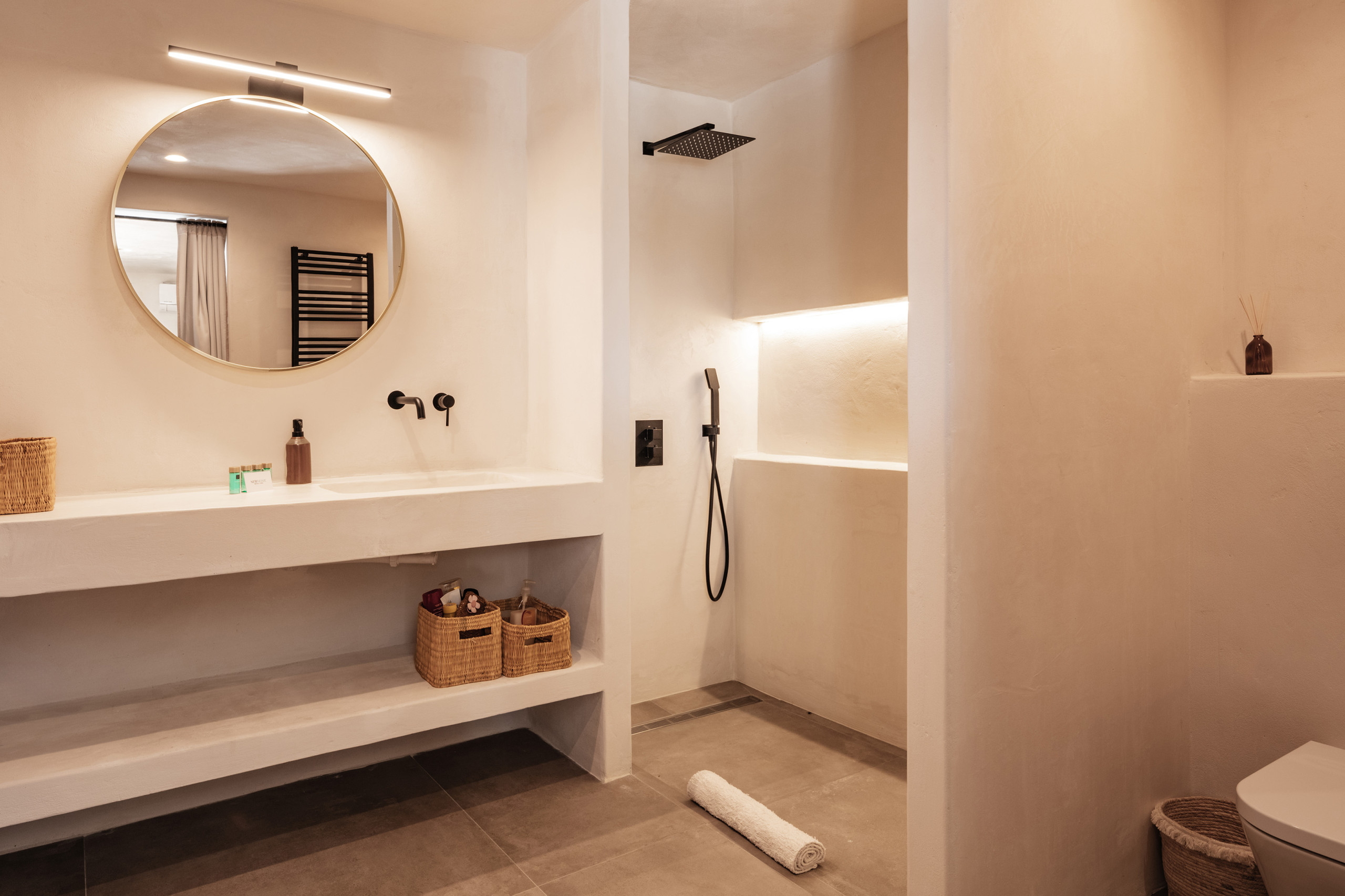 La villa dispone de seis habitaciones distribuidas para garantizar privacidad: dos con baño en suite en la planta superior y cuatro en la inferior, dos de ellas también en suite. Todas incluyen camas de 1,60 y armarios empotrados en la mayoría.