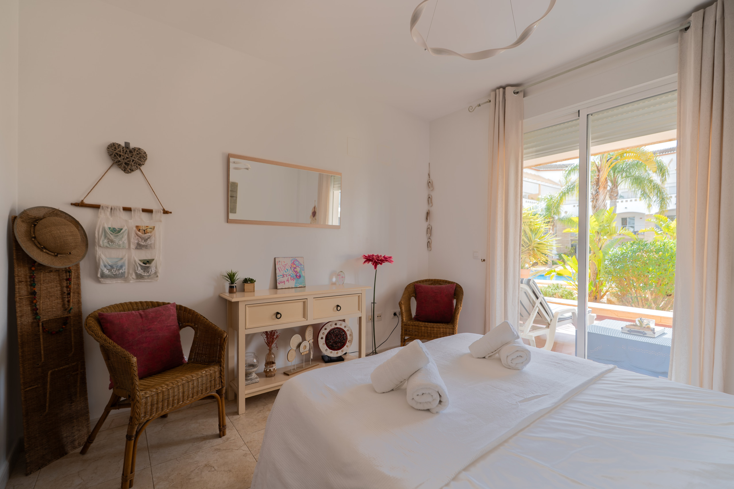 En la segunda planta, está la habitación principal con baño en-suite y acceso a dos terrazas privadas, perfectas para relajarte en tumbonas o disfrutar de los muebles exteriores.