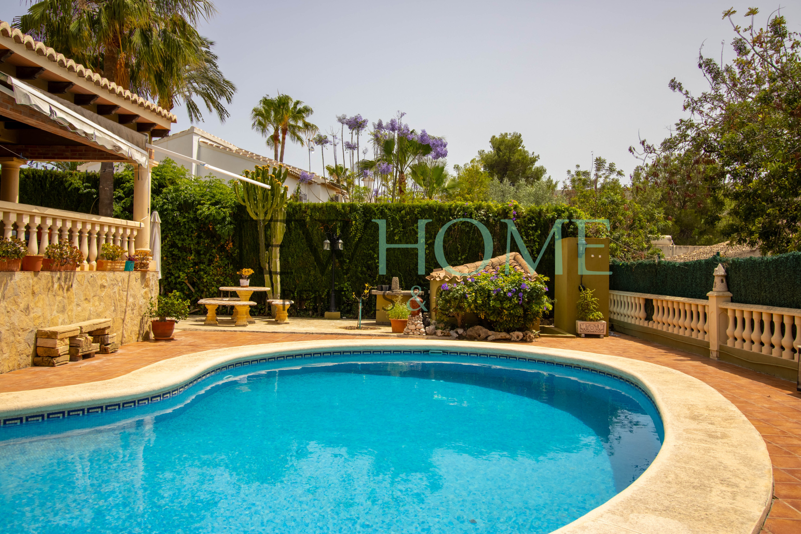 The property offers a spacious living‑dining room, a fully equipped separate kitchen, and a furnished covered terrace with direct access to the private pool and garden—ideal for enjoying the sun.
