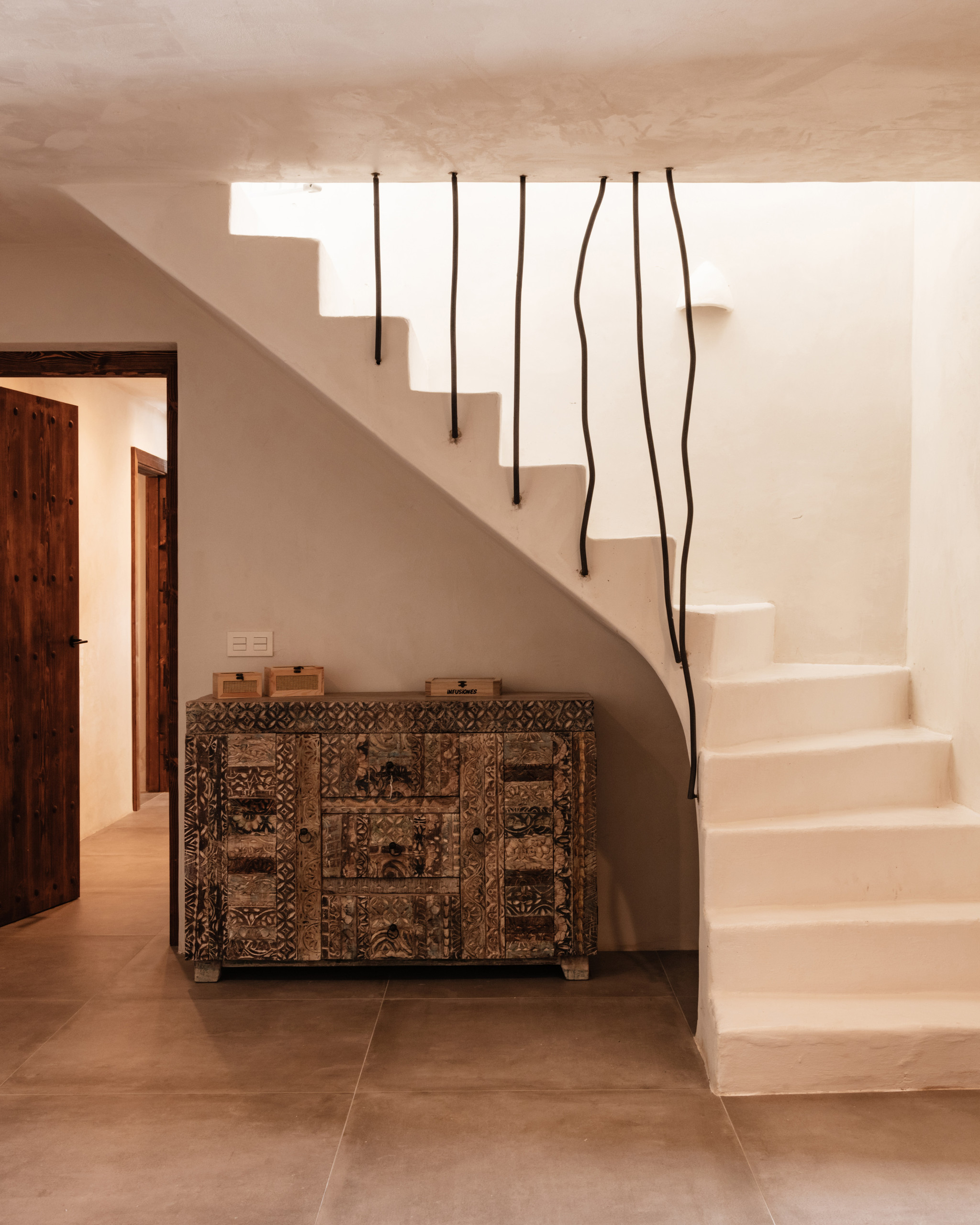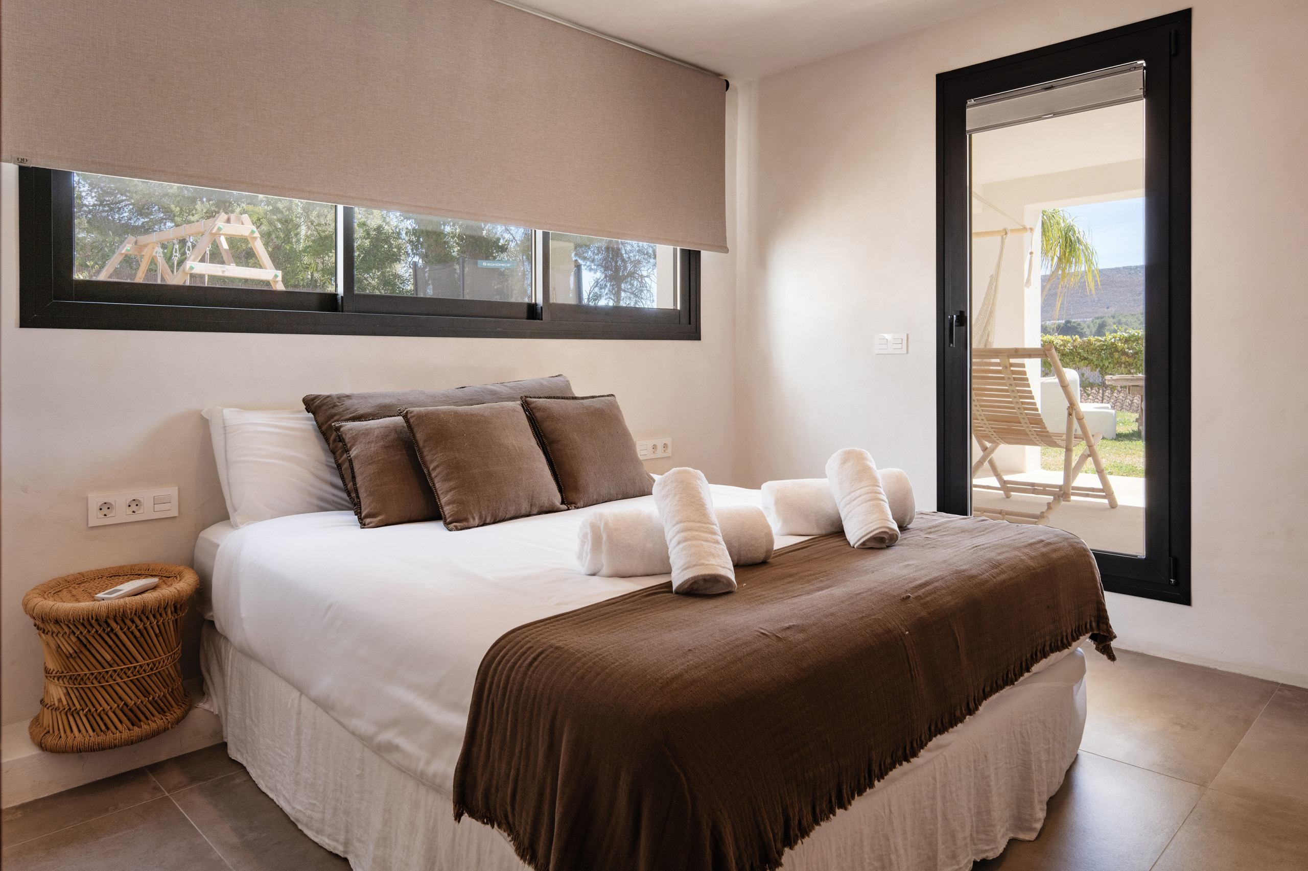 The villa offers six bedrooms designed for privacy: two with en‑suite bathrooms on the upper floor and four on the lower level, two of them also en suite. All bedrooms include 1.60 m beds and most have built‑in wardrobes.