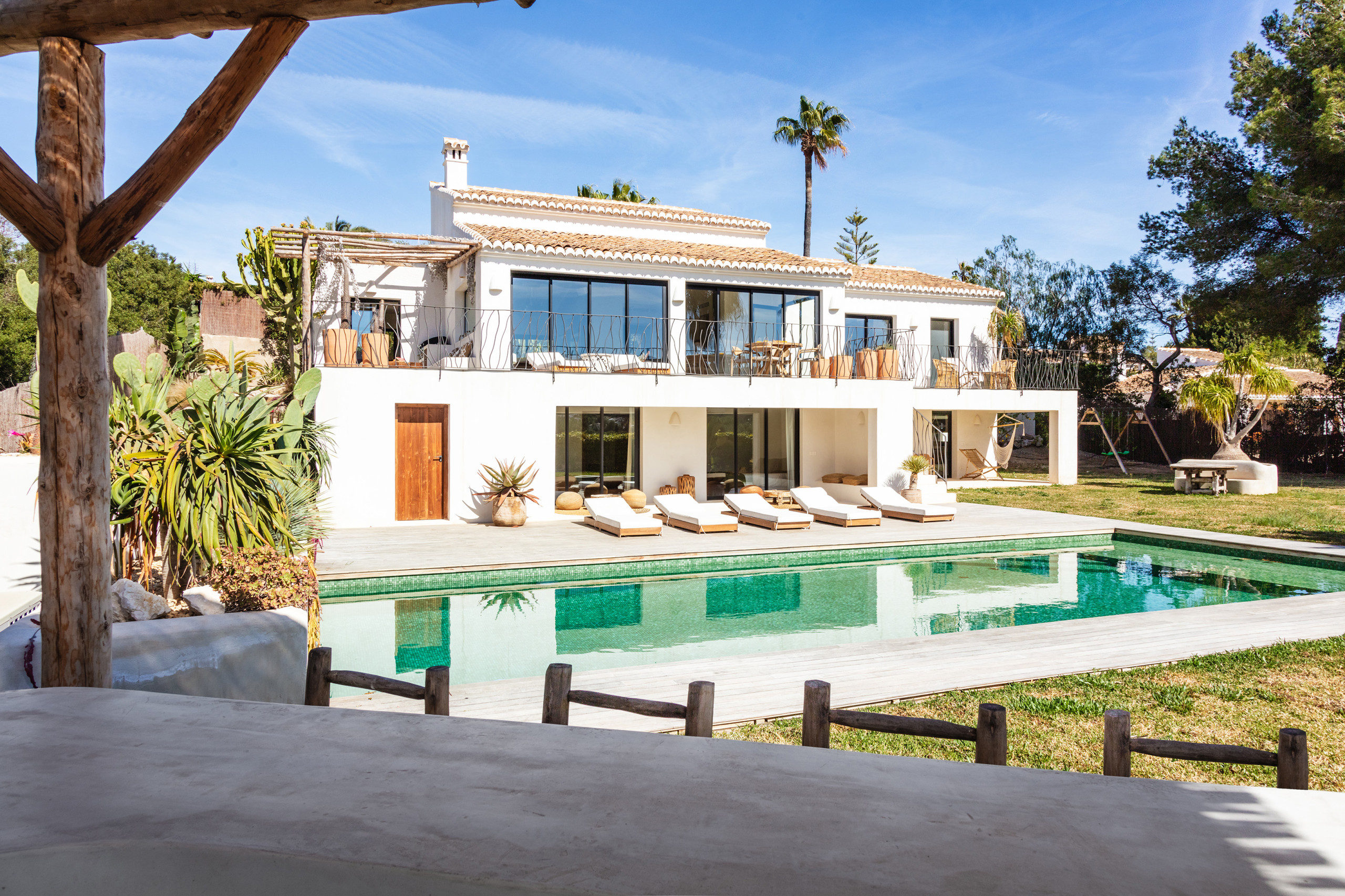 Discover this elegant Mediterranean villa in the exclusive area of Tarraula, Jávea. With spectacular views of the Cumbre del Sol and the golf course, the property offers a peaceful setting surrounded by gardens and green areas.