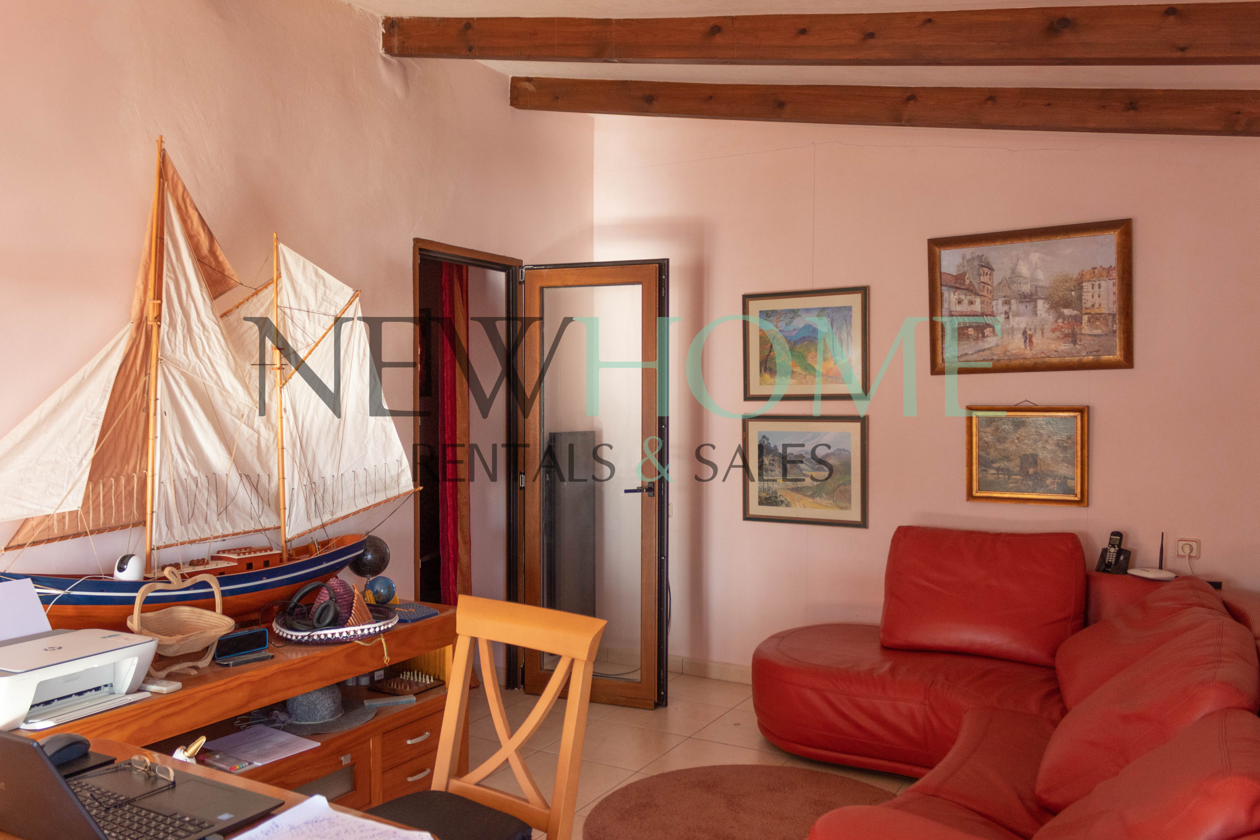 Le rez-de-chaussée abrite un hall d'entrée, une salle de bain, une chambre, une cuisine, un salon-salle à manger et un salon très lumineux, tandis qu'à l'étage inférieur se trouve un porche, la chambre principale avec tre zone de vie, dressing et salle de bain attenante, ainsi qu'une autre chambre avec zone de vie et salle de bain privative.